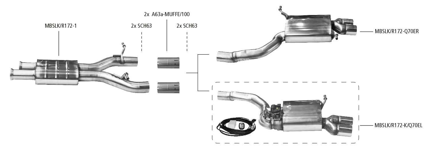 Die Sportauspuffanlage für den Mercedes SLK 350 (R172) besteht aus einem Vorschalldämpfer und einem Endschalldämpfer. Den Endschalldämpfer bieten wir in mehreren Varianten an. Als „Twin“ Endschalldämpfer (Endschalldämpfer mit Einfach-Endrohr LH+RH, 1x Ø 54 mm) ist dieser mit Endrohr rechts und links erhältlich und ist optimal auf die Serienendrohrblenden abgestimmt. Alternativ ist auch die Variante „Quattro E“ (Endschalldämpfer mit Doppel-Endrohr, 2x Ø 70 mm LH+RH, mit Lippe) erhältlich.