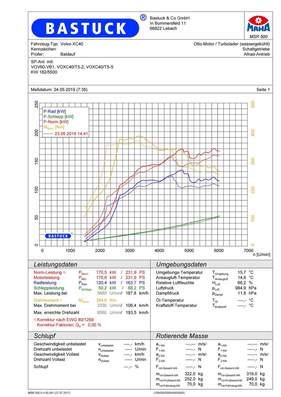 *) Ref-Fzg.: Volvo XC40 182 KW / 5500 U/min., Eingangsmessung: 158,9 KW / 367,8 NM; Messung mit Sportauspuffanlage 170,5 KW / 384,6 NM, Steigerung um 11,6 KW / 16,8 NM