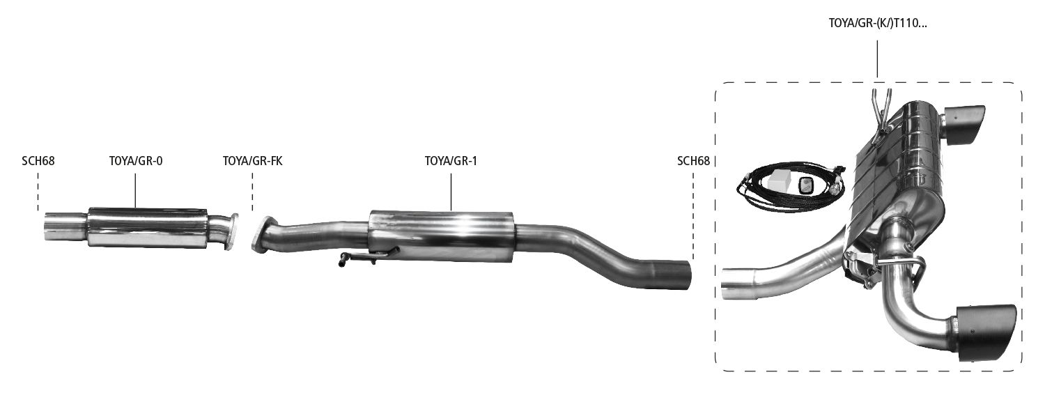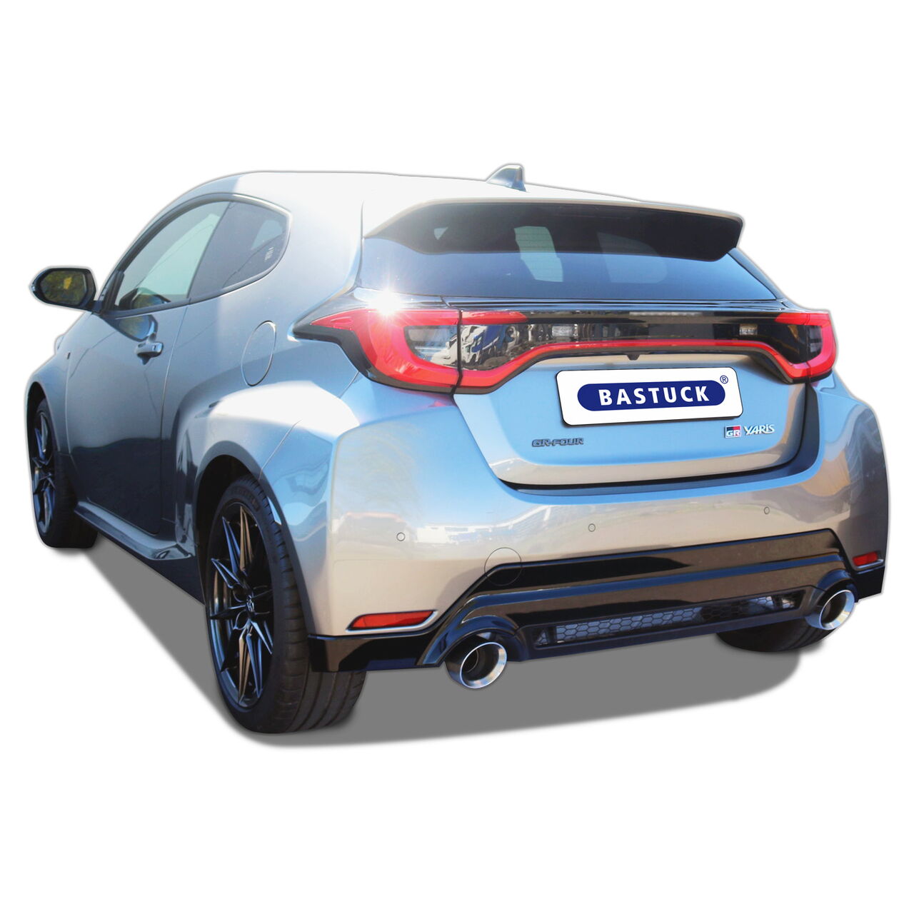 La variante de silenciador trasero "Twin RACE S" (con tubo de escape único 1x Ø 110 mm LH+RH, inclinado 25°, en look RACE) es la que más se acerca a los genes deportivos del Toyota Yaris GR Facelift, mientras que los tubos de escape de la variante "Twin Carbon RACE S" (con tubo de escape único 1x Ø 110 mm LH+RH, carbono, inclinado 25°, en look RACE) aportan al look deportivo un toque sofisticado gracias a los tubos de escape de carbono. Ambas variantes están disponibles con y sin válvula de escape. Al pedir el sistema de escape deportivo con válvula de escape, se incluye en el volumen de suministro el mando a distancia por radio (este artículo no está autorizado para su uso en vías públicas, ¡sólo para fines de competición!).